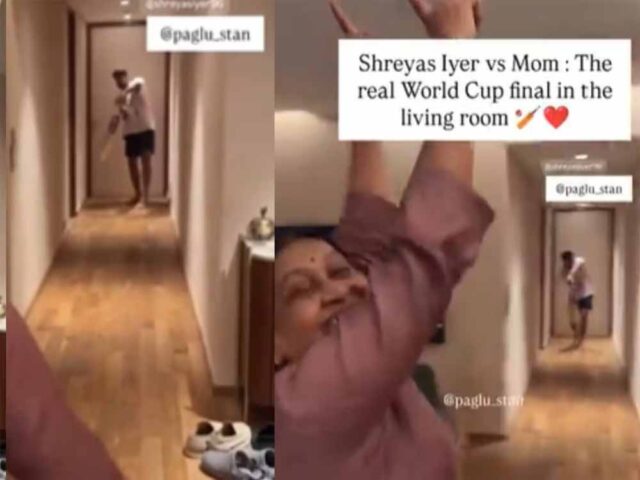 एक्स पर शेयर किए गए वीडियो में दिख रहा है कि श्रेयर अय्यर घर की गैलरी में बल्लेबाजी कर रहे हैं और गेंदबाजी की कमान उनकी मां के हाथों में है। पहली गेंद फुल टॉस और अय्यर उसे खेलने में कामयाब होते हैं लेकिन दूसरी गेंद पर वह नाकाम हो जाते हैं। गेंद उनके बल्ले को चकमा देकर पीछे दीवार रूपी स्टंप से टकरा जाती है। उसके बाद तो उनका मां का सेलिब्रेशन भी देखने लायक है। वह दोनों हाथ हवा में उठाकर खुशी से कूदने लगती हैं। बोलती हैं- आउट।